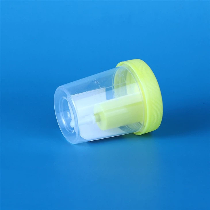 Šis plastikinis šlapimo surinkimo puodelis yra plastikinis surinkimo puodelis, užsegamas varžtu ir integruotas perkėlimo įrenginys. Tai yra greitesnė ir lengvesnė šlapimo surinkimo alternatyva.